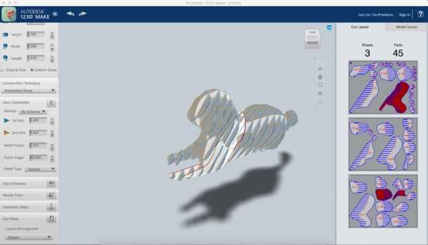 La etapa final en la computadora fue crear realmente las piezas. 123D lleva modelos 3D y cortes en que se enclavija, apilar o plegado de planos. Ésta era probablemente la parte más fácil en todo el proceso. Todo lo que tenía que hacer era corregir la escala, elegir mi técnica de construcción, ajustar el espaciado y luego jugar con el ángulo de las láminas. Luego había exportado los archivos en formato pdf.