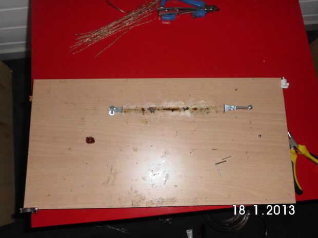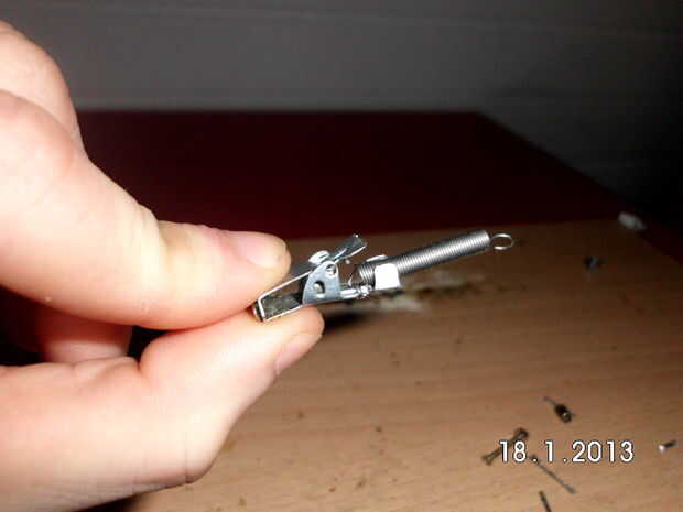 He jodido una abrazadera de metal en el tablero y había unido el muelle a otro, luego atornillar el resorte en la Junta. La distancia entre las abrazaderas es tuya decidir sólo recuerdo que determina la longitud de los cables que se trabaje.