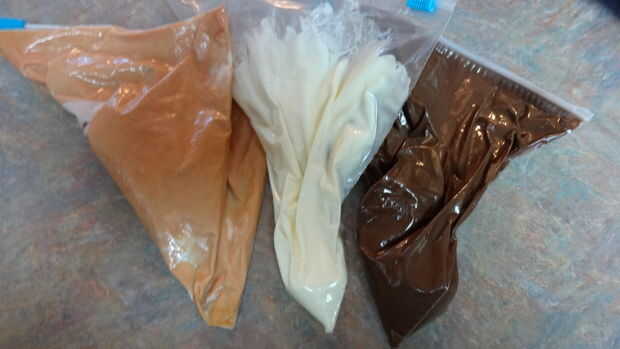 Siguiendo la plantilla, un contorno de la zona coloreada de la pipa primero luego volver y rellene. Mientras el chocolate está caliente todavía puede utilizar su cuchillo para alisar hacia fuera. Continuar de esta manera hasta que haya esbozado y llena cada color.