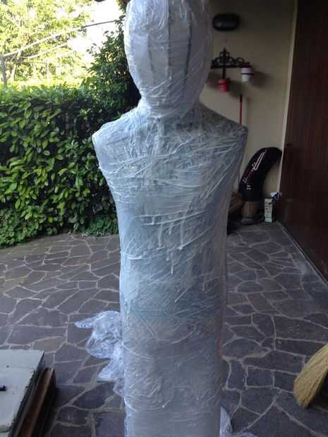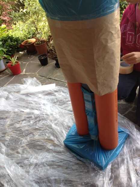 y para las piernas un par de tubos de polipropileno envueltos con papel.