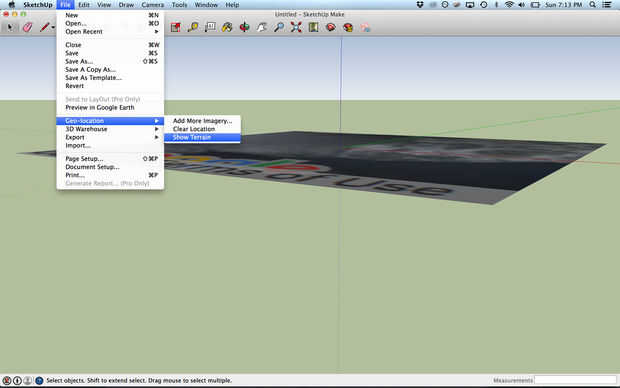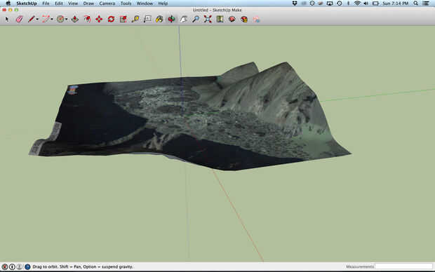 Una vez que ha seleccionado e importados la topografía, aparecerá como un rectángulo plano. Revelar los datos topográficos haciendo clic en ' File--> Geo localización--> Mostrar terreno '. La topografía de su plaza debe aparecer ahora en la vista.
