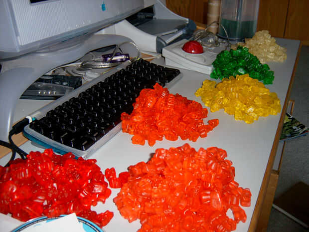 Para mí, quería una creación gummi de tamaño completo, así que sólo separados para agregarlos en por separado una vez derretido. Crea un efecto de arco iris.