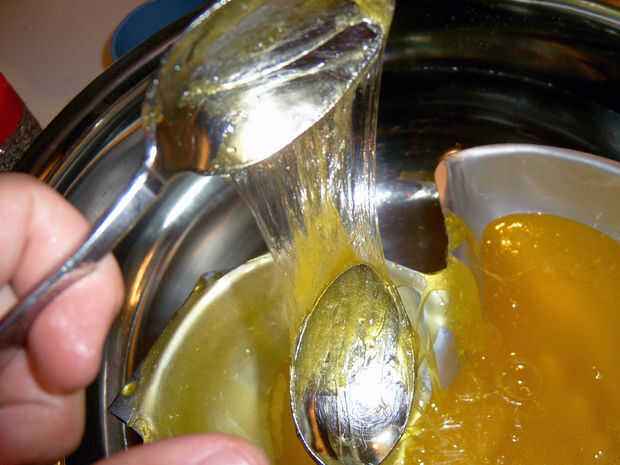 Dependiendo del color de efecto que quieras, mezclado, separado o vierta algo más los colores al mismo tiempo y mezclan con un utensilio (no toque el gummi fundido!). O si estás limitado en macetas y no preocupan por efectos interesantes puede calentar una olla y verter, luego ir al siguiente color. Esto da un efecto de arco iris de que colores tienes.