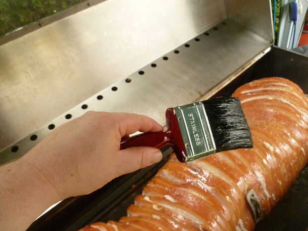 Pintar el cerdo otra vez rápidamente con algunos de los hilvanes de limón y aceite. Luego Espolvoree un puñado de sal marina fina sobre el cerdo mientras gira. Trate de no perder demasiado calor.
