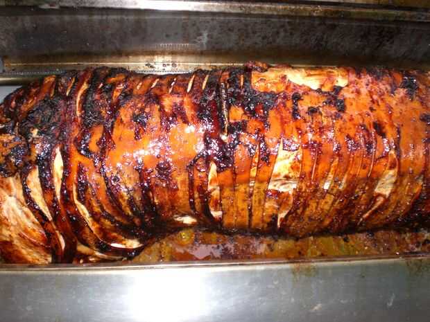 Una vez haya quitado todos los chicharrones listos, pintar la carne expuesta con algunos de los restantes hilvanado, ahora mezclado con algo de miel para la condimentación adicional, untuoso. Encienda el asador y volver 1/2 hora más tarde.