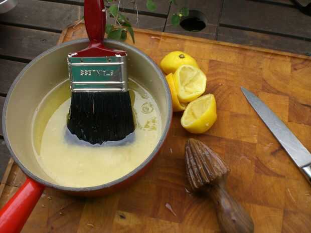 Jugo de los 6 limones y se mezcla bien con 1 litro de aceite de cocina. Darle un buen revuelo con el cepillo, el cepillo ayuda a emulsionar la mezcla. Ahora debe tener un verdadero bote de piggie-pintura que huele maravillosamente!