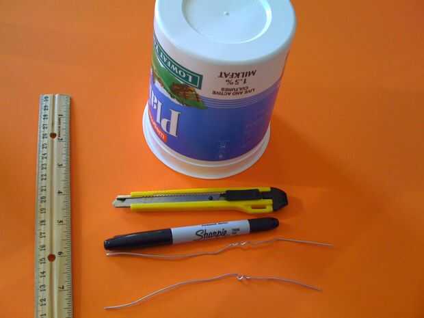 Para corregir esta situación, he utilizado uno de nuestros muchos envases de yogur vacíos, unos lazos de torcedura (alambre, ataduras de cremallera o clips haría bien) y un cuchillo.