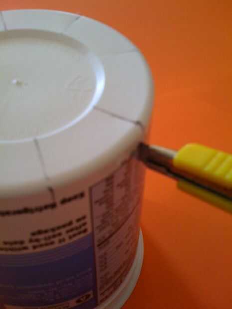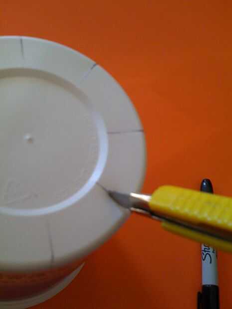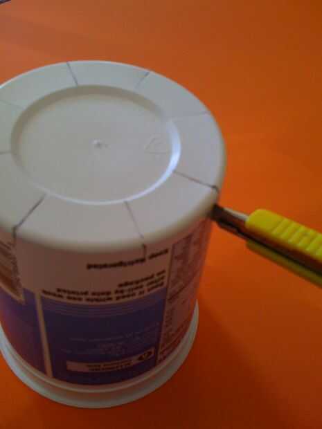 Cortar el envase en las líneas a partir de cerca de un cuarto de pulgada hacia arriba el lado a sobre pulgada del centro.