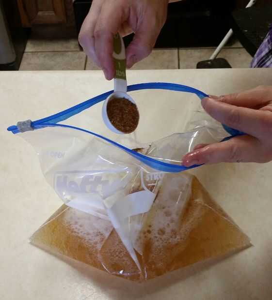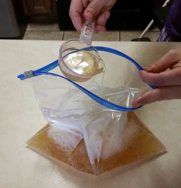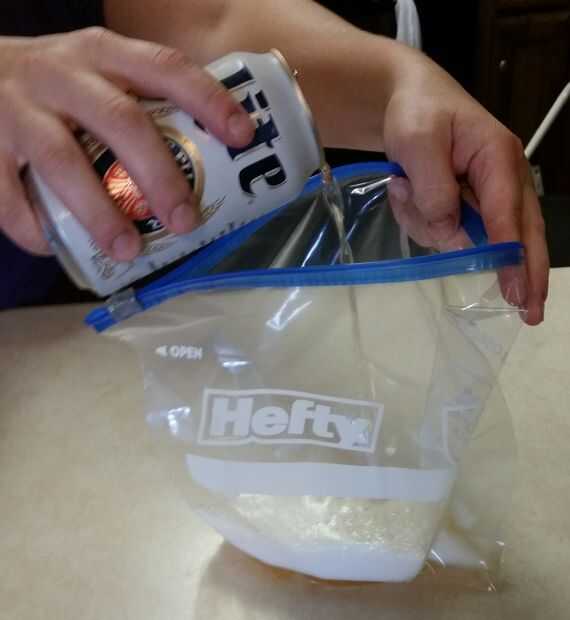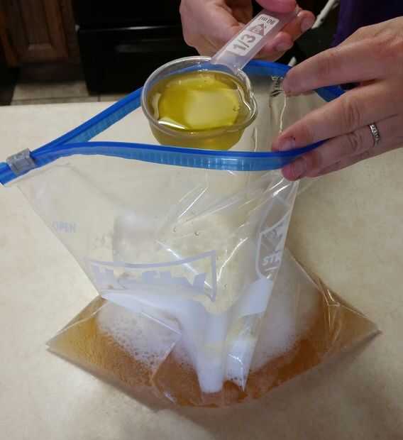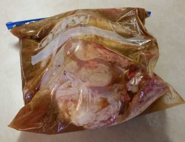 Tome la bolsa de plástico de galón agregue la cerveza, esencia de especia, aceite de oliva, vinagre de arroz y luego agregar los piernas/muslos de pollo en la mezcla.