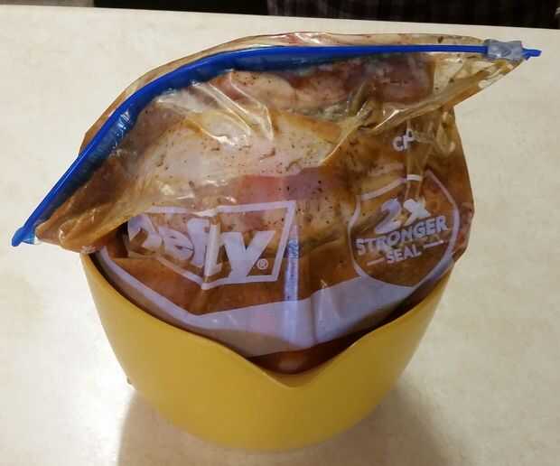 Asegúrese de que le exprima la mayor parte del aire y hacer un buen sello. Agite la bolsa para mezclar hasta el adobo muy bien y ponerlo en un tazón grande para mantener el sello hacia arriba.