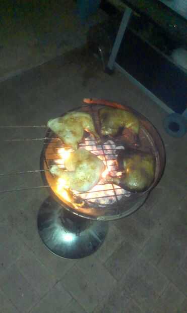 Vuelta sobre un par de veces durante el proceso hasta que esté listo. Esto tarda aproximadamente una hora a dos horas de asado tiempo dependiendo de cuán caliente sus carbones son y de qué nivel usted mantener la rejilla en. Sugiero que el más alto nivel para no quemar el pollo. Acabar con los pollos con el lado del hueso hacia abajo también.