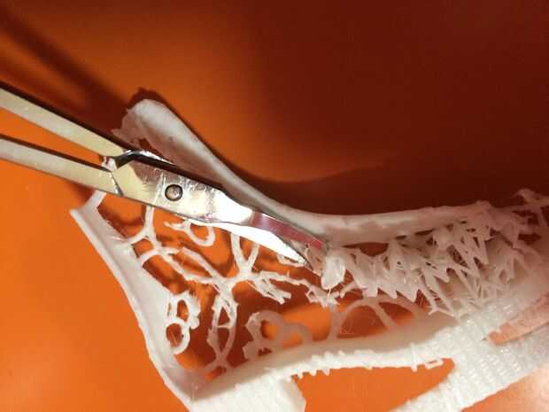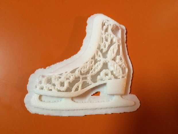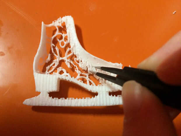 Para crear el prototipo para mi Adorno, imprimí el patín del hielo en dos mitades mediante una balsa y apoyo material. Entonces quité el material de apoyo utilizando pinzas y tijeras de uñas. Eliminación del material de apoyo fue un proceso muy tedioso y muy muy mucho tiempo. Nivel del modelo actual, la superficie del modelo es muy frágil, y quitar el material de apoyo puede causar partes de la superficie a romper. Después de retirar el material de apoyo, utilicé gel super pegamento para fusionar las dos mitades.