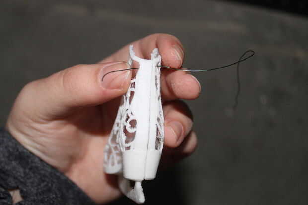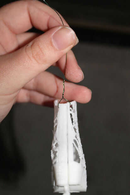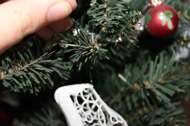 Para sujetar el adorno de un árbol, utilicé un trozo de alambre fino. Cable funciona muy bien porque fácilmente puede ser conectado a través de los cortes en la superficie de la ornamentación. Hay un camino claro en la parte superior de la espalda del ornamento donde puede cadena su trozo de alambre a través de. Una vez hecho esto tuerza los extremos del alambre por lo que su ornamento ahora se une por un lazo. Si se corta el alambre lo suficientemente largo, este debe dejar una buena cantidad de alambre izquierda para envolver alrededor de la rama de árbol.