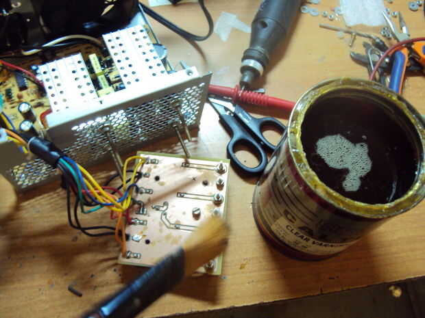 Ya que este es un PCB hecho en casa, para evitar la corrosión de las pistas simplemente aplicar capa de barniz claro.
