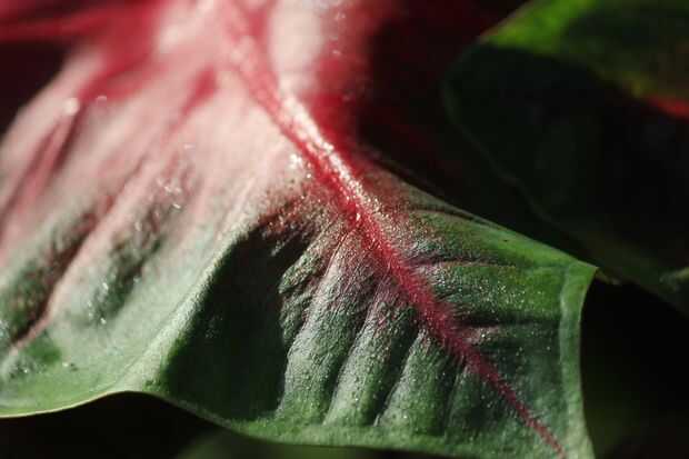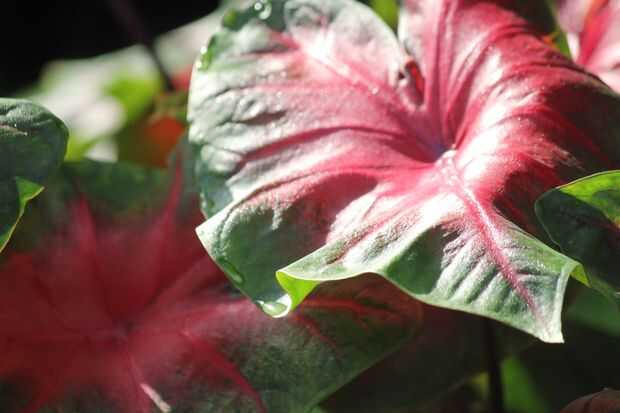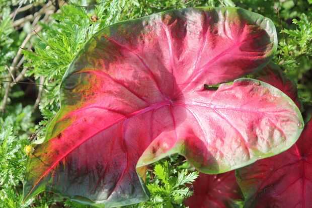 Como ves, puede empezar a ver algunas cosas que destacan sobre los demás. En el caso del parche de jardín, las hojas de Caladium proporcionan un placer visual, reflejando la luz de maneras interesantes de sus hojas anchas. He elegido uno y tomó algunas fotos de lado, recto arriba y en el borde de la hoja.