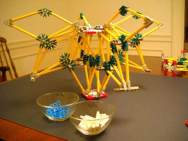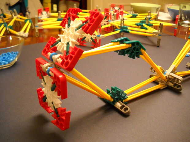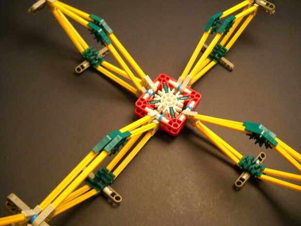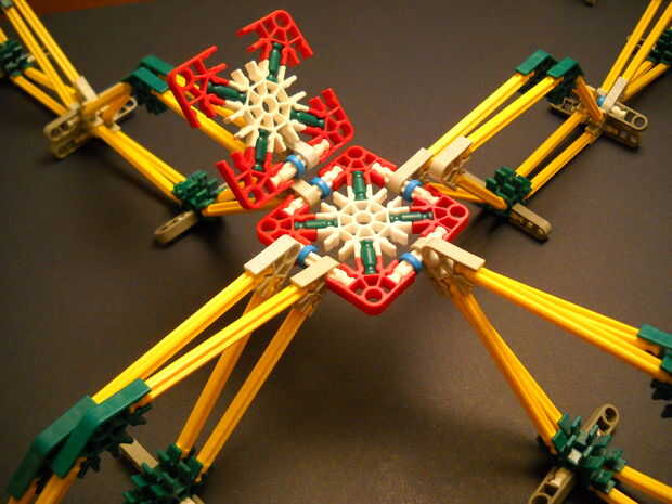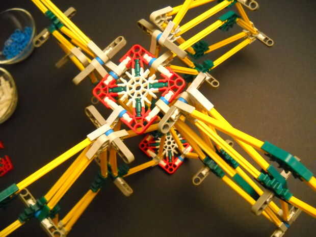 Añadir tres pares más de la tijera alrededor de los bordes del cubo "de fondo", teniendo cuidado de conectar el rombo de fondo, no la parte superior (segunda foto). Luego baje el eje superior y conectar a los rombos superiores de las tijeras (tercera imagen).