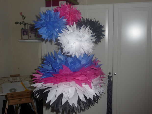 Un tiempo atrás compré un conjunto de tres de ellos en la tienda de partido local para una fiesta de oficina. Mientras que configurarlos rápidamente se dio cuenta de que había gastado dinero en algo yo probablemente podría han hecho yo mismo. Gente les aprisionado delante de mí, así que yo no era capaz de agarrar a uno para llevar a casa a mi hija después de la fiesta. Por lo tanto, cuando unos meses más tarde llegaron su cumpleaños y quería decoraciones similares, pensé que daría un giro. Ella quería un tema de varios color, así que fácilmente habría me nuevo por $20 solo para tener los cuatro colores representados había he comprado en la tienda. Resultó bien. Hemos sido capaces de personalizar el diseño colores y tamaños y terminamos haciendo muchas, cada partido-goer llegó a tomar uno, o dos, como favores. Son bastante fáciles de hacer, y una vez que el cuelgue de ella, no toman ningún tiempo en absoluto.