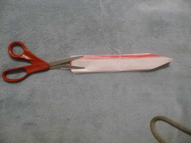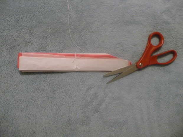 Usted querrá agarrar tus tijeras otra vez para esta próxima etapa. Podrá cortar dos piezas triangulares de cada extremo de su rectángulo a los puntos de la forma (o redondo, si quieres un look más suave... Lo he visto ambos sentidos). Encontrar más puntos, mejor. Tratar de que los lados coinciden, pero de nuevo, sólo algo estético y no es necesario.