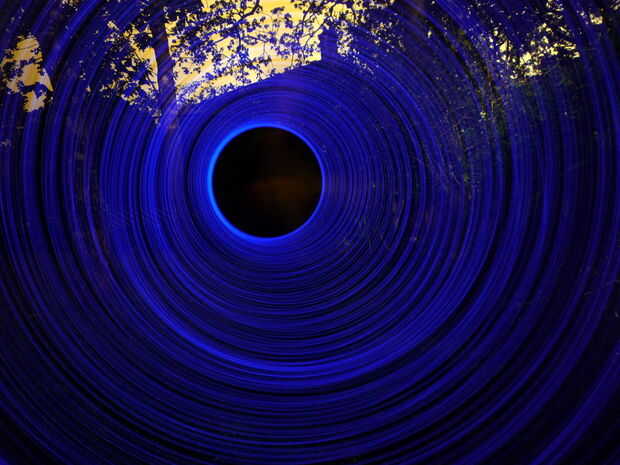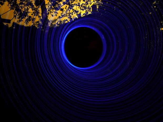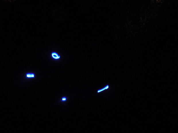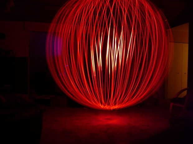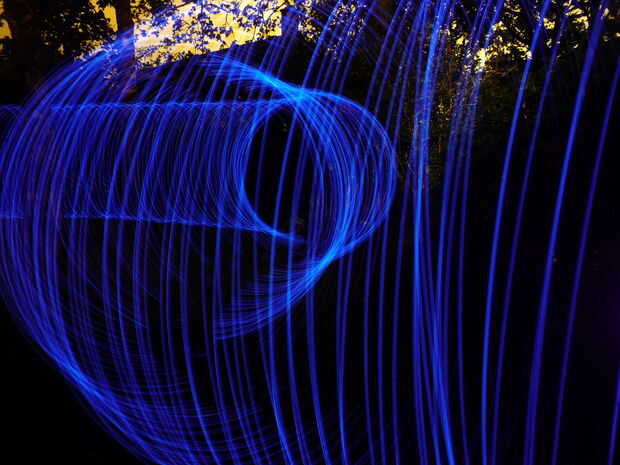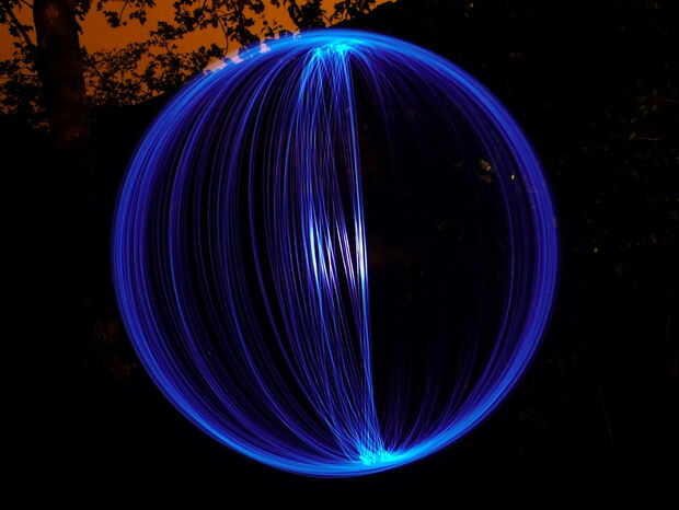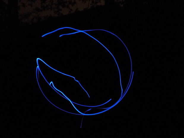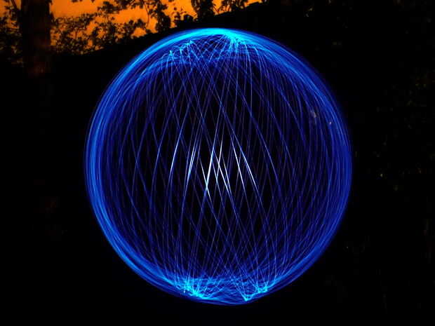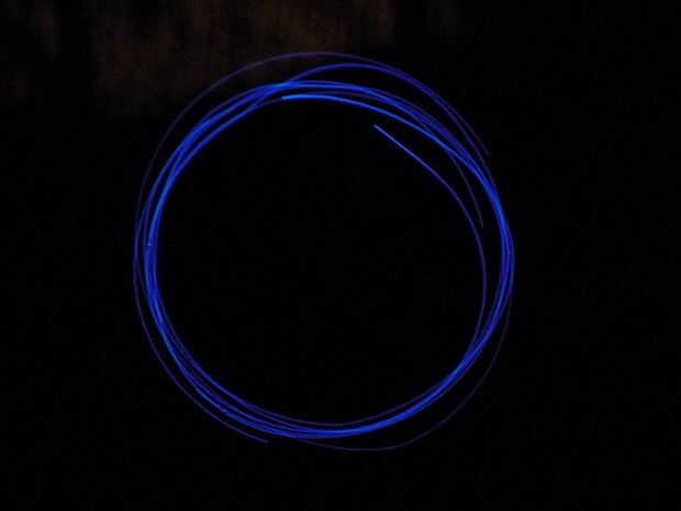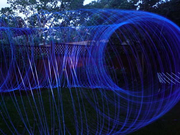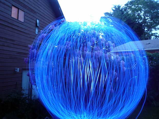 algunas linternas de LED UV, algunos chapucero con un taladro inalámbrico + una astillas de madera y alambre de cobre y una cámara compacta con un ajuste de "noche estrellada" (larga exposición, por ejemplo 15-60 segundos) permite crear impresionantes pinturas de luz muy fácilmente. Es esencialmente la ULTRAVIOLETA, energía herramienta versión de la bola de E. Soporte todavía para crear un círculo. Gire lentamente para crear una esfera. Caminar alrededor para crear un agujero de gusano-como túnel. A pie de la cámara para crear un efecto de hiperespacio . Funciona igual de bien con otras linternas de color también, por supuesto - es muy divertido, y va deflector a personas si haces uno de estos cuadros... Ver la foto de la segunda a la última para averiguar cómo junté la fuente de luz de giro. Las esferas aquí son unos siete pies de ancho y pase cerca de seis pulgadas por encima del suelo.
