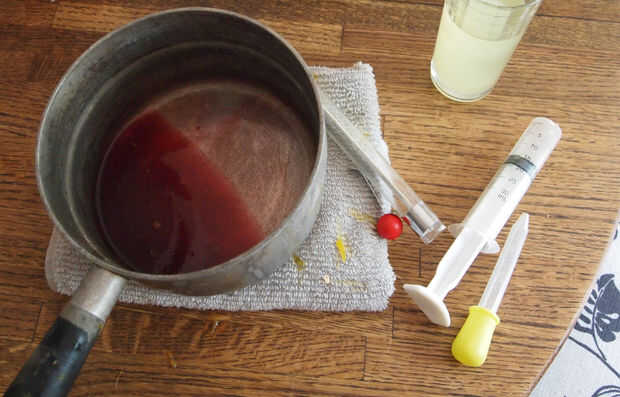 Una vez que la temperatura del líquido disminuye lo suficiente, asegúrese de tener la fría taza de aceite y gotero o jeringa cerca. Tome el gotero y mantenerlo por encima de la taza por lo menos unas pulgadas - y gota lejos. Usted puede hacer esto sorprendentemente rápido con sólo exprimir el líquido fuera el gotero - forman tan perfectamente. Si todos ellos están flotando cerca de la cima, debe intentar sostener su gotero más así que la fuerza de la gota ayudará las esferas para caer al fondo de la taza. Está bien si algunas de ellas flotan en la parte superior - a veces eso sucede con esferas más pequeñas o cuando empiece a caer.