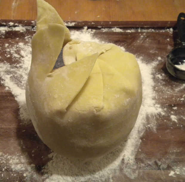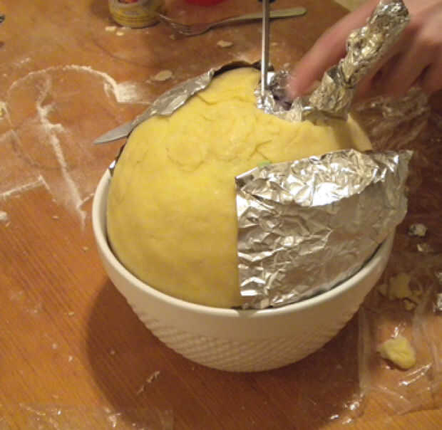 Corte una abertura con un diámetro de al menos 5 cm alrededor del nudo del globo. Esto se convertirá en la parte superior de su pie. Sosteniendo el nudo, pinchar el globo con una aguja para desinflar y eliminar desde el andamio. La lámina debe ser suficiente para soportar su pasta quebrada en la configuración esférica adecuada.