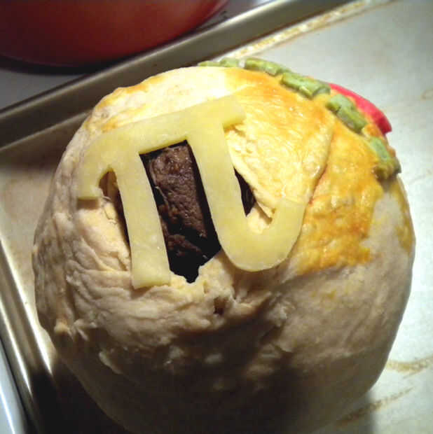 Una vez relleno la tarta completa con carne, se cubre el agujero superior con masa de empanada, dejando espacio para que escape el aire. Cubrir la esfera entera en un lavado de yema de huevo y un lugar en el horno precalentado 400oF en un anillo de papel. Cocinar durante 15-20 min o hasta que el pastel tiene un tono marrón dorado. Sacar del horno y deje enfriar para un poco antes de agrietarse abierto.