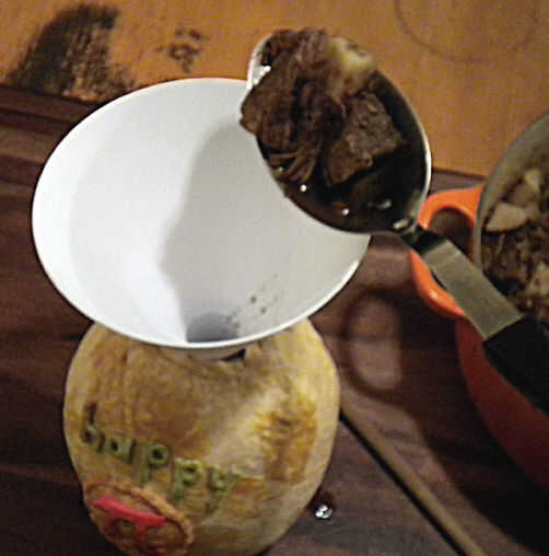 Tan pronto como la hoja se ha eliminado totalmente es hora de agregar el relleno de carne. Usando un embudo de boca grande, cuchara de las carne y las patatas estofadas en la tarta. Utilice el extremo de una cuchara de madera para empujar con cuidado el relleno a través del embudo y a dispersar el guiso a lo largo del interior de la esfera.