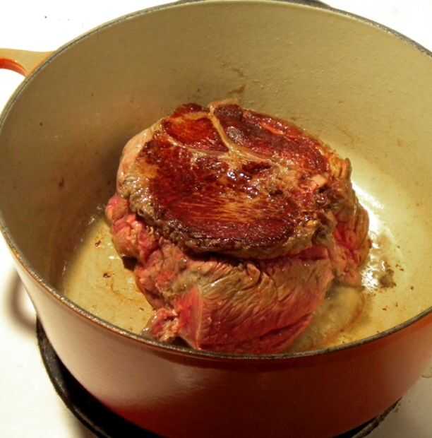 Caliente el aceite a fuego medio en una cazuela de horno. Frote la sal y la pimienta sobre el hombro de carne. Añadir carne a la olla caliente y hombro marrón por todos lados. Una vez doradas, retirar carne de olla y apartar en un plato de carne.