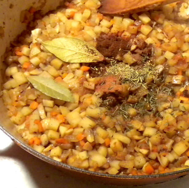 Añadir tomillo, Romero, clavo de olor, pimienta gorda, canela, hojas de la bahía y revuelva para combinar. Lentamente Vierta la cerveza stout para Desglasar la olla, raspar cualquier bits marrón con una cuchara de madera. Agregue el caldo de carne y llevar a ebullición.