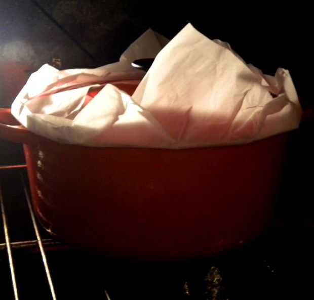 Después de 30 minutos, retire el guiso del horno. Aproximadamente, picar la carne en trozos de 1-2 pulgadas y vuelva a agregar al guiso. Seleccionar las hojas de laurel y descartar. Apartar la carne y deje que se enfríe antes de proceder al relleno.