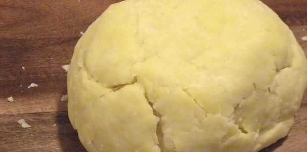 Caer la yema de huevo en el centro del montón y añadir unas gotas de agua con la punta de los dedos. La cantidad de agua necesaria dependerá de la humedad y el calor de su ambiente de trabajo, así como la calidez de tus manos. Continuando a mezclar con los dedos, poco a poco incorporar la harina y mezcla la mantequilla hasta que pueda formar una bola. Con la palma de su mano, empuje la masa en la mesa hasta obtener una consistencia homogénea. Parece más amarillo en color y la masa será más suave. Puede que deba agregar agua para ayudar a hacer la masa más suave.