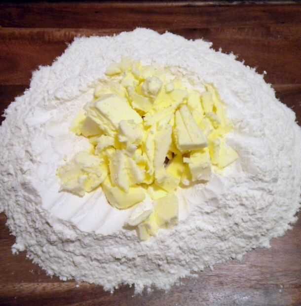Coloque la mantequilla en el centro de su montículo. Con los dedos trabajar poco a poco la harina en la mantequilla hasta que se forme un crumble. Vuelven a formar un montículo con la mantequilla y mezcla de harina y una vez más, ahuecar el centro.