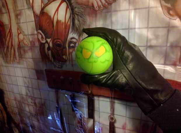 Hay varias maneras de ir sobre la pintura. Antes de empezar los ojos del Grinch, aerografiado un tono más oscuro de verde a lo largo de las líneas que había dibujado con el rotulador. Esto era un poco más de profundidad y carácter en el resultado final. No es un paso necesario, pero sin duda puede hacer una diferencia en el producto final. Entonces puso amarillo donde van los ojos. Usted puede ser un poco más descuidado, porque usted va delineando los ojos con la pintura negra. Estoy pintando en capas en esta foto. Me fui con base verde/sombreado verde/amarillo/rojo/negro.