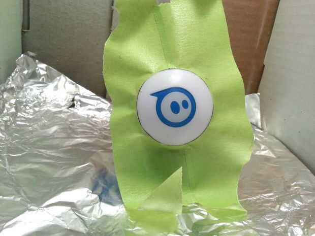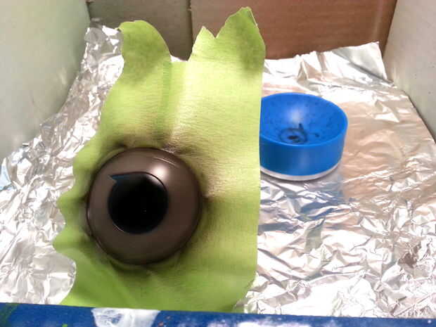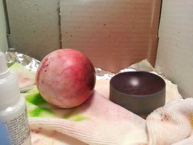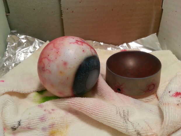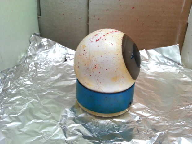 En primer lugar, crear una plantilla de círculo en cinta adhesiva y el lugar que en esfero sobre el logo. Luego usando un aerógrafo, pintar en la zona de iris y pupila. Quitar la cinta y comenzó a aplicar capas de colores y vetas técnicas. El propósito de usar pinturas y las tintas más transparente es para que las luces de dentro esfero aún brillará brillantemente a través de. Esfero 2.0 funciona especialmente bien para este proyecto porque los LEDs interior son mucho más brillantes que su predecesor, que le da el personalizador de la capacidad de salirse con más pinturas en capas.