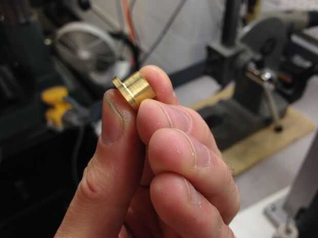 Me volví un pedazo pequeño en un torno, asegurándose que el diámetro interior coincide con el vástago del indicador lo más cerca posible. El aspecto más importante del esferómetro es la concentricidad de todos los componentes. Si se mantiene la punta del indicador del centro, sus lecturas serán completamente inexactas. También desea hacer un seguimiento del diámetro exterior de este manga, porque tendrás que hacer coincidir al girar el cuerpo principal.