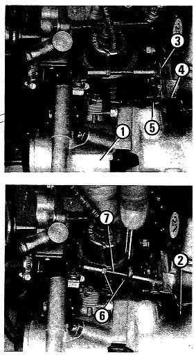 Una vez el ralentí a la velocidad correcta, apriete la tuerca con cuidado. Vuelva a colocar la barra de acoplamiento. Si RPM es mayor, aflojar contratuercas 6 y alargar ligeramente la barra. Vuelva a colocar al correcto.