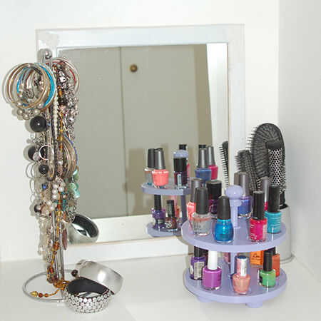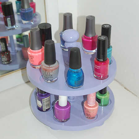 Esmalte de uñas generalmente termina arrojado en el fondo de los cajones o metidas en un bolsa de maquillaje. Con este carrusel de esmalte de uñas puede tener todas sus botellas coloridas a poca distancia. Dos bandejas en el carrusel proporcionan suficiente espacio para 16 botellas de esmalte de uñas, pero si usted necesita más que eso puede aumentar la altura y añadir una bandeja adicional o dos. Terminamos nuestro carrusel de esmalte de uñas con satén lila de Rust-Oleum de francés, pero usted puede elegir un color que coincida con la decoración de su habitación.