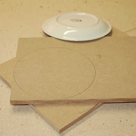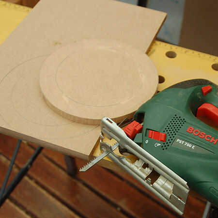 3. apretar el tablero para una mesa de trabajo y cortar con una sierra de calar.
