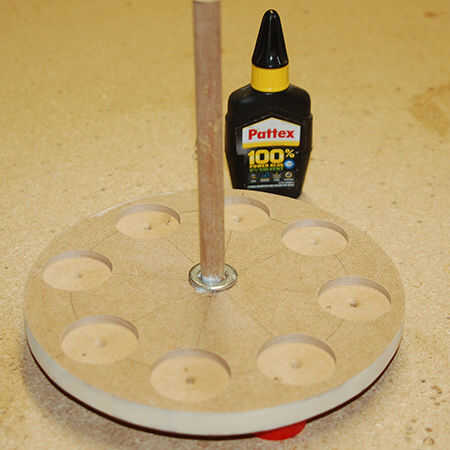 11. aunque aquí se muestra una cola diferente, le recomendamos que uses pegamento epoxi para fijar la base y Añadida la arandela. Combinar el epoxi y utilice un palillo de dientes para aplicar en el centro alrededor de la espiga. Mientras que todavía húmedo, pop sobre una arandela de acero y Aplique pegamento epoxi en el centro de esta, así. Una vez, girar y aplicar pegamento alrededor de la base de la espiga.