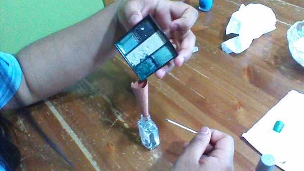 2. Usando un palillo de dientes, de desecho de un color de sombra de ojos de un color puro en el embudo. Por un color más opaco, poner dos colores similares. Agite bien.