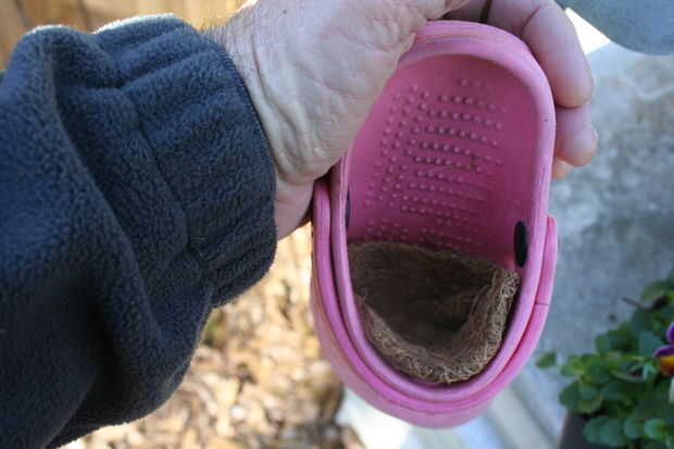 Corte una tira del revestimiento del coco sólo lo suficientemente grande como para cubrir los agujeros en el zapato. Cerca de 2.5" de ancho y 6" de largo para la Croc "s que tuve. Estos son los zapatos de niños pequeños tamaños adultos llevaría un pedazo mucho más grande. Doblar y meter dentro el zapato