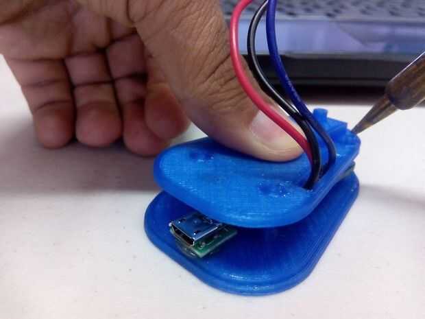 - Luego de esto se va a montar la pieza va en medio para sostener el DS18B20 y sirve de soporte. Notar los cables se están pasando de forma integración por el hueco!!!.
