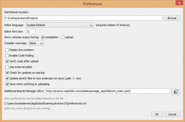 Para hacer este abierto Arduino, Goto archivo -> Preferencias y entrar en: http://arduino.esp8266.com/stable/package_esp8266... en el tarjetas adicionales Gerente de cuadro de texto URL' '.