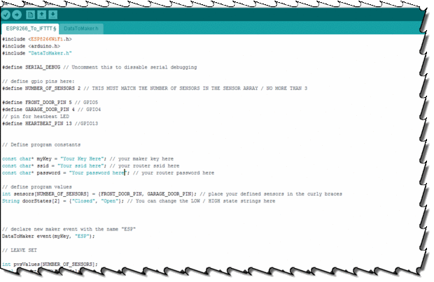 Ahora descargar el bosquejo de ESP8266_To_IFTTT.ino y DataToMaker.h archivos de aquí y abrir en el IDE de Arduino.