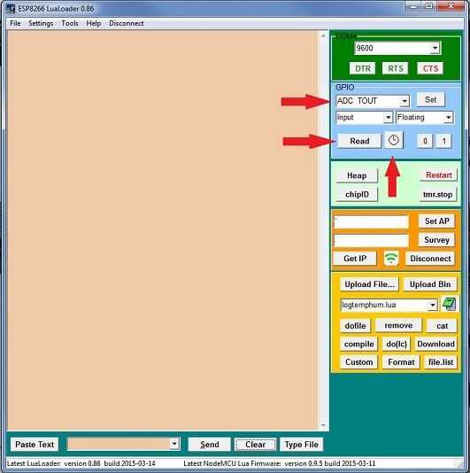 Una vez arrancado, con lualoader, usted puede leer/monitor el pin ADC TOUT. Uso o 'Lea' o 'autorepeat Lee'. Los valores se muestran en la ventana principal.