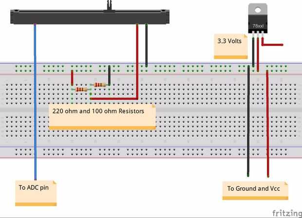 Para R1, utilicé un 220R y para R2, he usado resistencias de 100R. Mi voltímetro resistencia real era de 225 y 103.7 respetuosamente. La matemática indica que 220R y 100R deben dividir 3.3v a 1.03v. 225R y 103.7 deben ser ~1.04v. Todo muy cerca. En el protoboard, mi voltímetro Lee .98v.