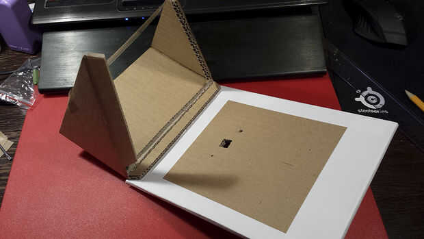 Ahora el pegamento en la pestaña inferior. Sostuve la pestaña doblada en su posición, aplica pegamento caliente sobre ella y luego rápidamente presiona la pieza frontal en, asegurándose de que pone plana sobre la mesa. Continuar aplicando pegamento en los pliegues de la ficha de lado y doblando rápidamente en su posición final.