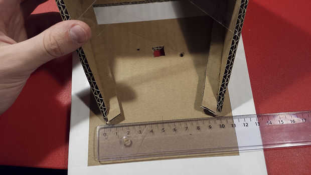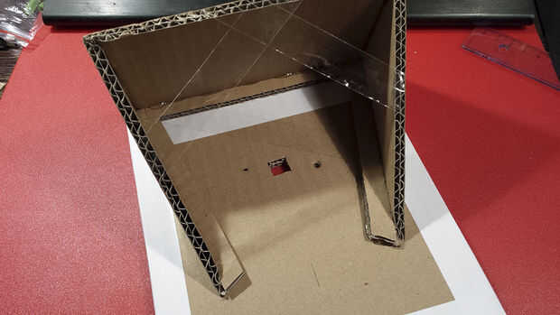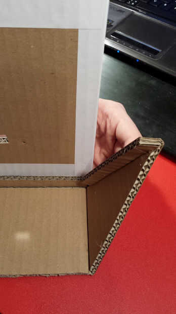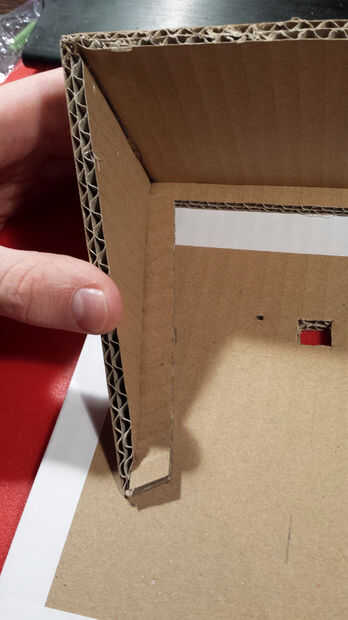 Ahora usted podría simplemente pegar los paneles laterales perpendicular, pero me decidí a último minuto para pegarlos en un ángulo para añadir algo de interés. Esto es donde la línea de centro es útil. Dobló los paneles laterales para que sus consejos terminan 5cm de la línea central. Marqué las líneas donde se terminan los bordes de los paneles. Puse pegamento en sus pliegues y había doblada en su posición, según las líneas. Entonces yo asegurada los paneles con alguna cinta para sostenerlos en el ángulo correcto.