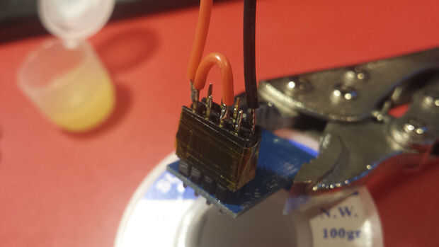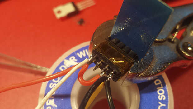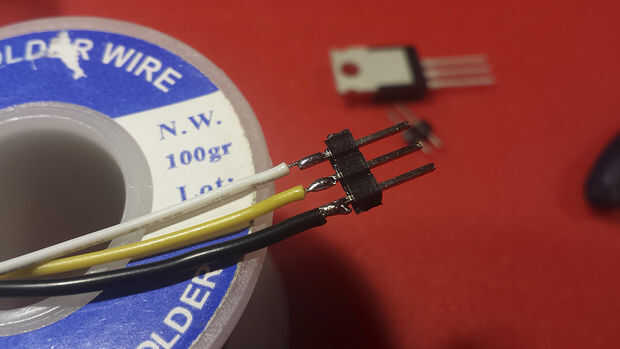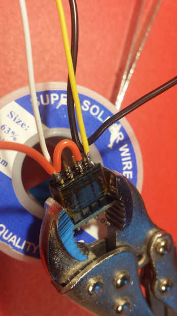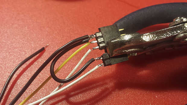Empezar el cableado hasta la electrónica. He creado una cabecera de perno femenino de 4 x 2 por grabar juntos dos 4 x 1. Esto hace fácil desconectar el módulo si es necesario. Sólo recuerda la polaridad correcta!