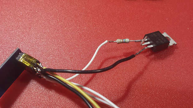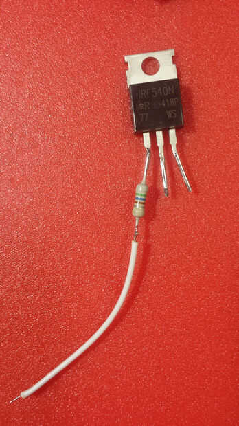 Tomar el mosfet, la puerta de la curva y fuente lleva a los lados. La curva del desagüe hacia arriba. Acortar la puerta, una resistencia de 560R a él junto con ~ 4 cm de la soldadura (~ 1 1/2 en) trozo de alambre. Conecte este cable (blanco) a GPIO2 del módulo ESP. Tomar el cable negro de tierra del módulo ESP y conectar a la fuente de lo mosfet.
